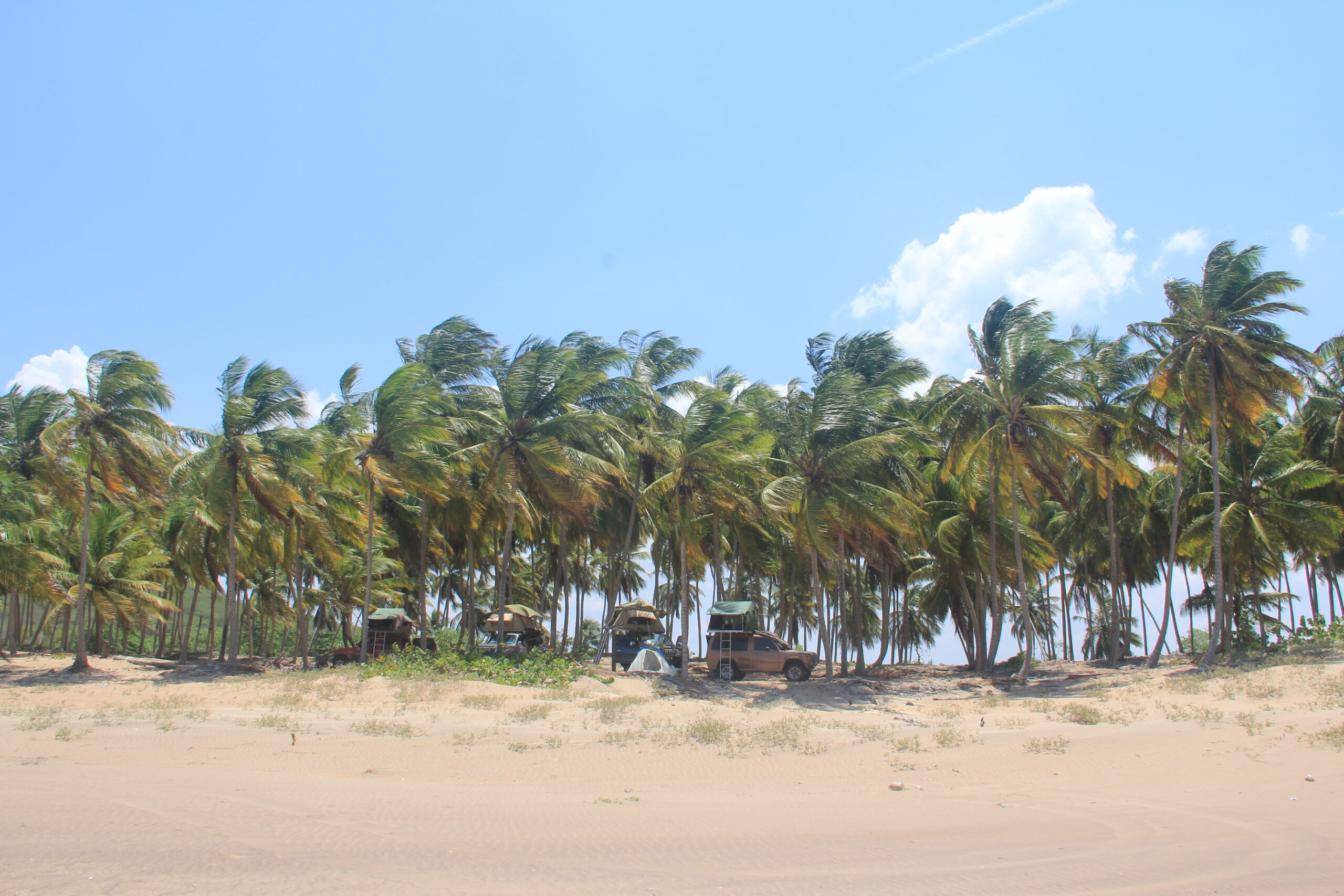 Ese día sábado transcurrió muy tranquilo, algunos, como yo, durmiendo y descansando del maratón que nos echamos en el camino hacia allá, otros caminando por la playa y otros sentados hablando y disfrutando de la música y el sol. Kiwi, mi perro copiloto estrella, por su parte se dedicó todo el viaje a buscar por todos lados y recolectar cocos debajo de la camioneta de uno de los integrantes del grupo. Al final del día, cuando nos dimos cuenta, era tanta la cantidad de cocos que había metido allí que tuvimos que comenzar a sacarlos, ya que si seguía a ese ritmo al día siguiente mi amigo no iba a poder arrancar. Qué perro más loco…
